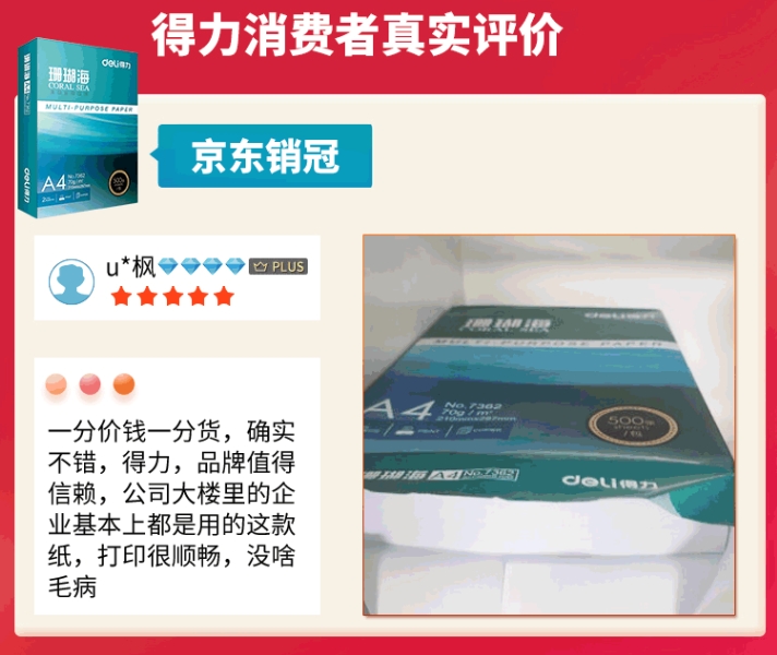 得力(deli)珊瑚海A4打印纸 70g克500张*5包一箱 销冠复印纸 双面草稿纸 整箱2500张 7361